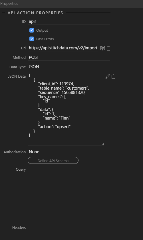 The entire block above needs to end up as valid json for it to work, and further it has to be what is expected by the api.