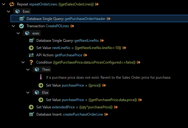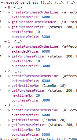 I believe I have found the bottleneck in the code. It seems like it’s only pulling “getPurchaseOrderHeader” only once and only applying it to the first repeat. This would explain why the value for the nextLineNo is always 10 because it defaults to an empty value when pulling “getNextLineNo”. Can anyone provide any fix to this, below is the server connect actions for this repeat: