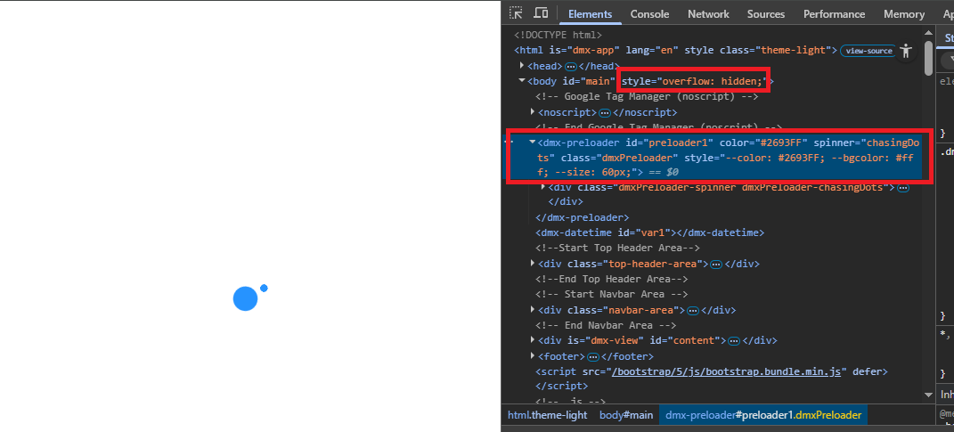 It looks like the preloader is having an issue on the root page, all other pages are working fine with it. I moved the preloader into a partial and it works fine in there - I’ll open a bug report for this as its been working fine for a long time.