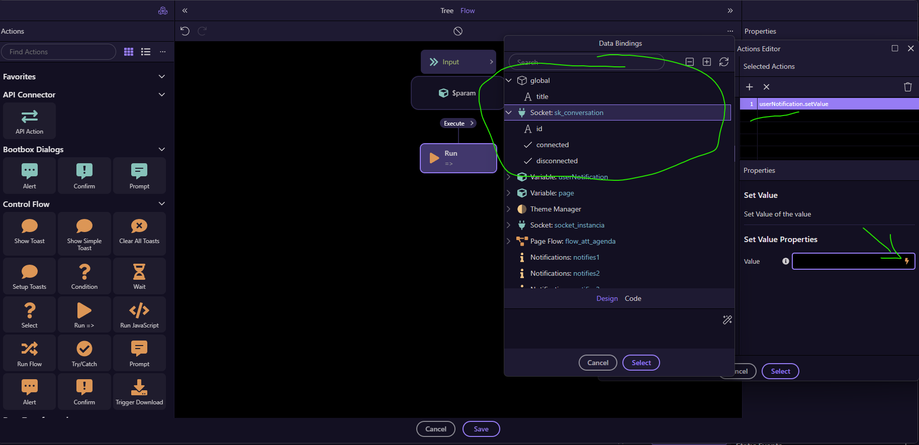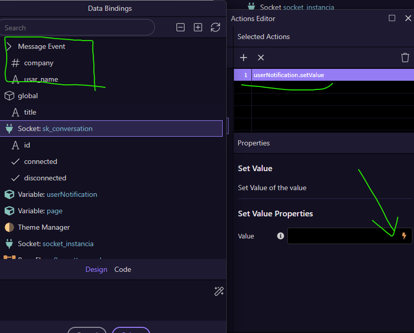 The thing is, I can only get events from the socket in the actions editor; not in the flow builder. I'm not sure if this is normal behavior or if there's a problem.