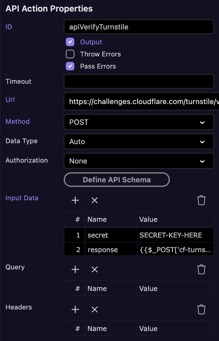 Then add an API Action in your Server Connect script (the URL is https://challenges.cloudflare.com/turnstile/v0/siteverify``):