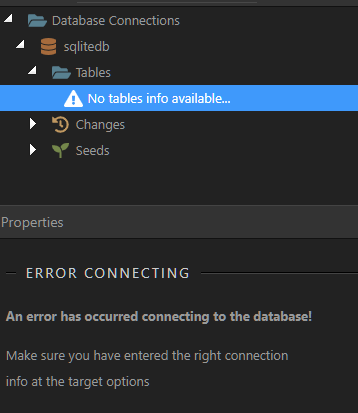 .. and could apparently set up database connection to a SQLite file successfully. However, adding a query, no tables were listed. In Database Manager, I clicked Direct Database Connection, but: