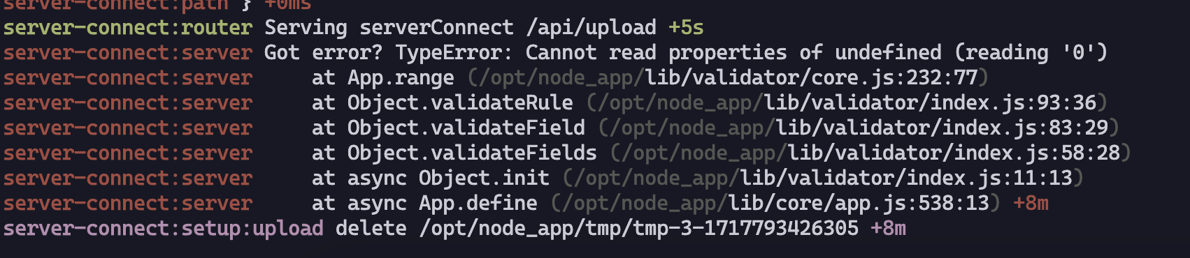 "stack": "TypeError: Cannot read properties of undefined (reading 'replace')\n at Object.errorMessage (/opt/node_app/lib/validator/index.js:108:24)\n at Object.validateField (/opt/node_app/lib/validator/index.js:86:45)\n at async Object.validateFields (/opt/node_app/lib/validator/index.js:58:17)\n at async Object.init (/opt/node_app/lib/validator/index.js:11:13)\n at async App.define (/opt/node_app/lib/core/app.js:538:13)"