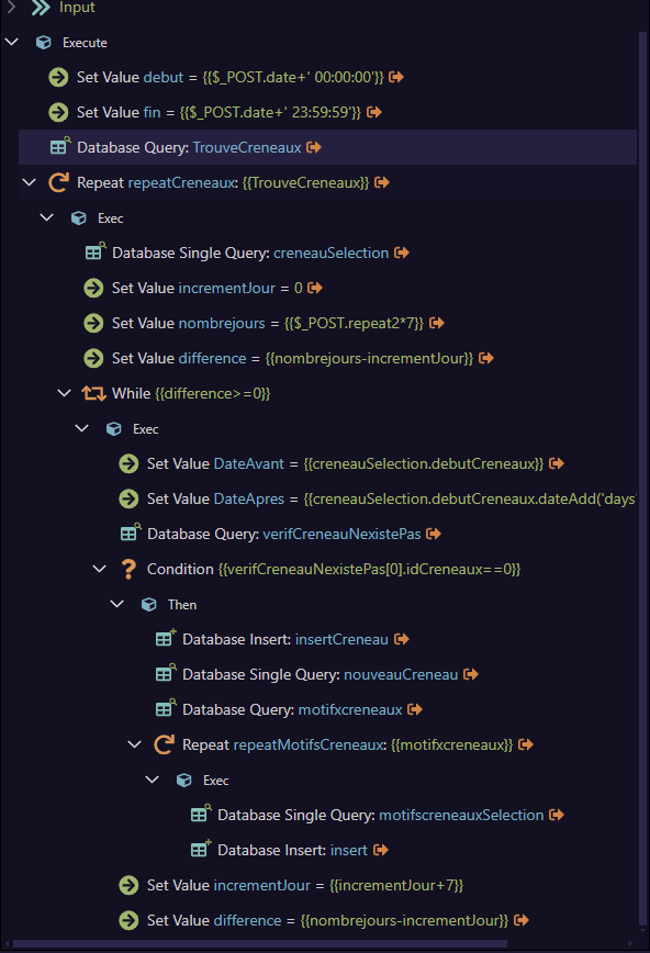 here it is for a duplication of event, I have a start date, an end date, as long as the end date is not exceeded I want to do an insert in my database. I thought to use a global variable, put the start date, in the while do a comparison, (I do not know if a simple operation is enough to compare two dates or if it is necessary to make a difference then put less than 0)