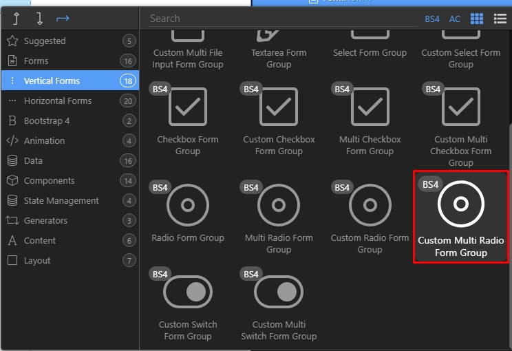 If you want to use the component with Bootstrap 4 - then use the radio controls available in the form elements: