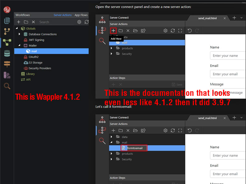 The menu at the top of wappler.io points to docs.wappler.io whereas Nishkarsh has mentioned docsdev.wappler.io (which is hidden?). Again, neither mention a version number and both are different so I still don’t really know which version of Wappler I should be using with which set of docs. Maybe it’s me, but the docsdev docs don’t even seem to offer guidance on creating an email form.