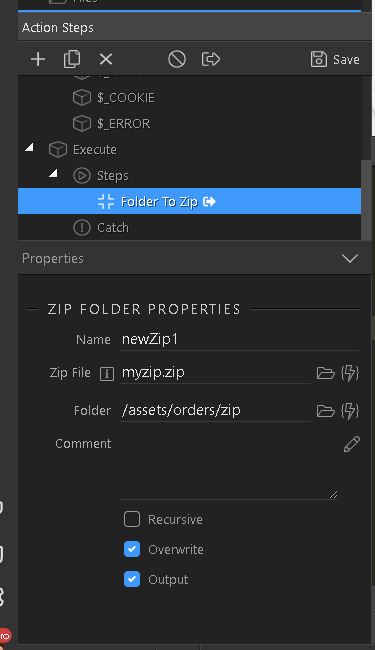 Saved the action and added at to my page as an auto load server connect command, on page load, it takes the entire folder called testZipFolder and creates a new zip file in the /imagesFolder/ called myzip.zip